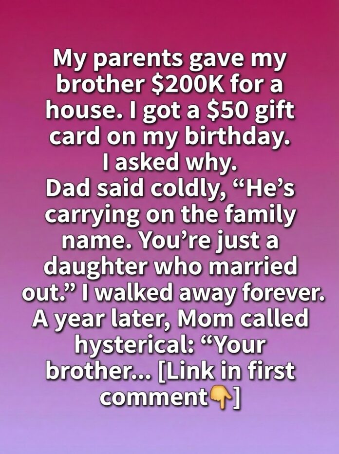 The turning point came one spring afternoon when Maya learned her parents had given Aaron a large financial gift to help him purchase a home. She was genuinely happy for her brother, but a small ache formed when she remembered that her own birthday gift that year had been a simple card and a modest present. Curious rather than angry, she asked her father if there was a reason for the difference. His response was brief and blunt. He explained that Aaron was continuing the family legacy, while Maya had chosen a life outside the family household. The words landed heavily, leaving Maya feeling unseen, as though her love and efforts had been quietly discounted.