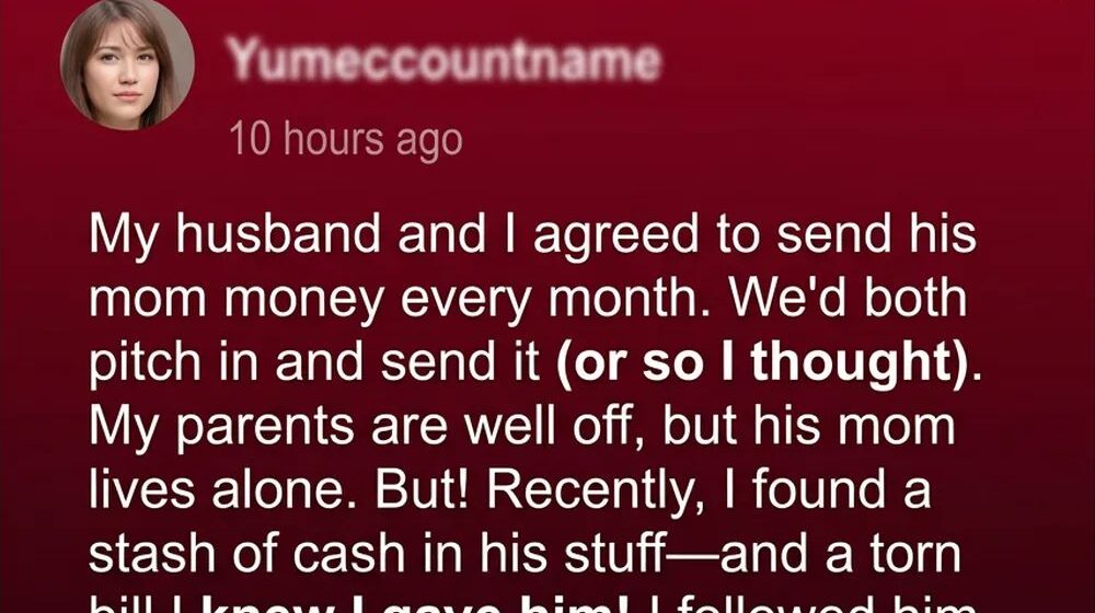 The first time I noticed something strange was on a quiet Sunday afternoon while organizing a drawer in our bedroom. My husband and I had agreed months earlier that we would send his mother a small amount of money each month to help with her living expenses. It was something we both felt good about doing. My parents were financially comfortable, but his mother lived alone and depended mostly on a modest pension. Every month I handed my husband my share of the money, trusting that he would send it along. But that afternoon, while searching for an old document, I found a small envelope hidden among his papers. Inside was a stack of cash—and mixed within it was a torn bill I clearly remembered giving him. At first, I tried to convince myself there must be a reasonable explanation. Still, the discovery left a quiet doubt that I could not ignore.