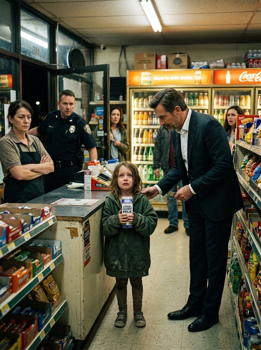 The child froze so completely it was as if the words themselves had turned her to stone. She could not have been older than eight. An oversized winter coat hung crooked off one shoulder, and the worn sneakers on her feet were clearly too large, the rubber soles dragging awkwardly across the tile. Held against her chest with desperate tenderness was a small carton of milk, clutched as if it were not food at all but something sacred, something that had cost her more courage than the adults around her could imagine.