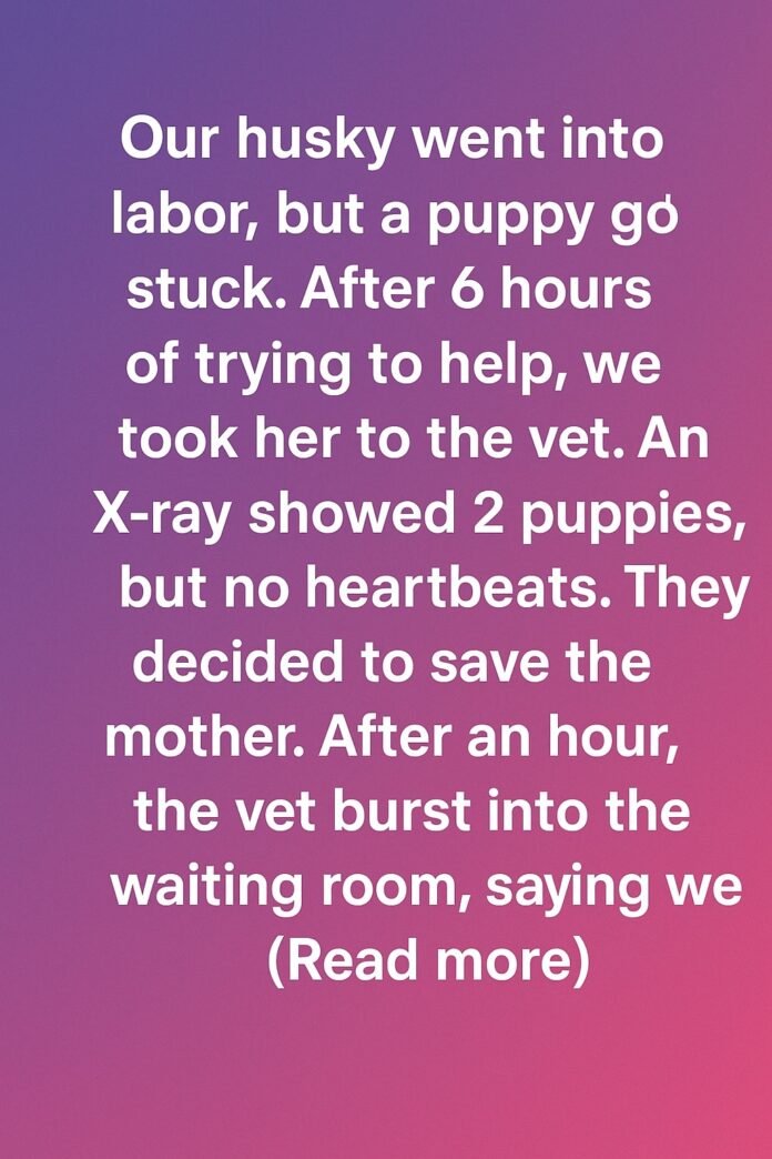 Our husky went into labor, but a puppy got stuck. After six exhausting hours of trying to help, we realized we couldn’t do it alone. With heavy hearts, we rushed her to the nearest emergency vet clinic. The X-ray revealed two puppies inside, but there were no signs of a heartbeat. The vet gently explained that they needed to act fast to save our husky, Luna.
