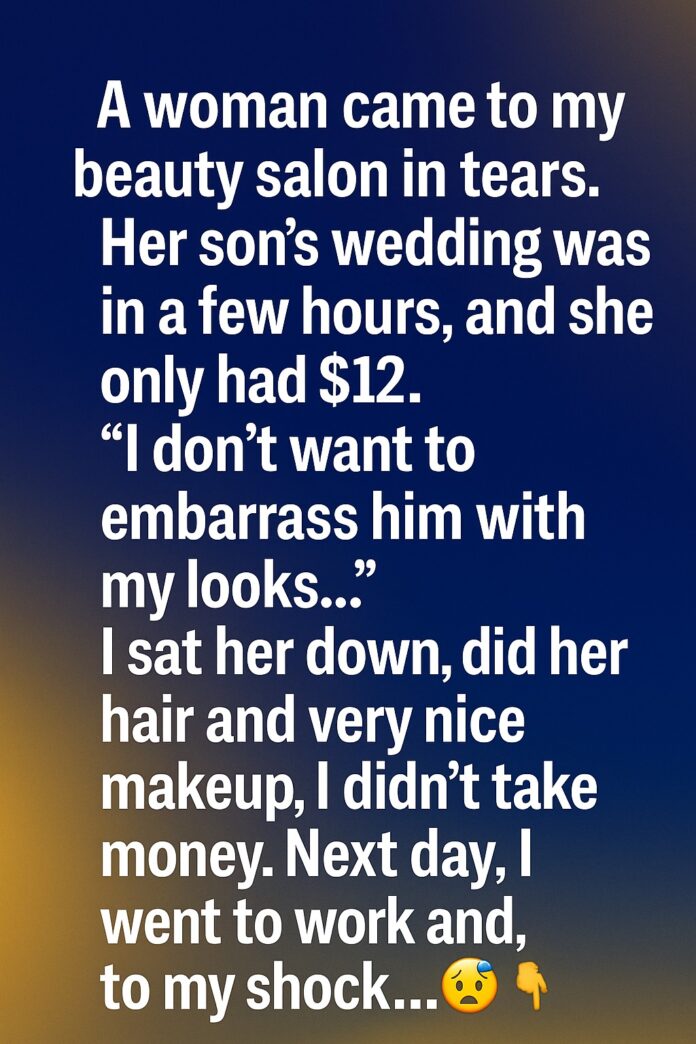 A woman came to my beauty salon in tears. Her son’s wedding was in a few hours, and she only had $12. “I don’t want to embarrass him with my looks…” she whispered, trembling with embarrassment. My heart softened instantly. This wasn’t vanity — it was love. I sat her down, brushed her hair gently, and did her makeup with the same care I would give my own mother. When she tried to hand me the money, I closed her palm and smiled. “Today isn’t about payment. Today is about love and celebration.” She left with grateful eyes and a confidence that lit up the room more than any lipstick ever could.