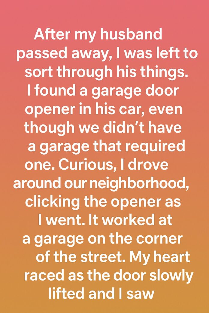 After my husband passed away, I was left to sort through his things. I found a garage door opener in his car, even though we didn’t have a garage that required one. Curious, I drove around our neighborhood, clicking the opener as I went. It worked at a garage on the corner of the street. My heart raced as the door slowly lifted and I saw what was inside.