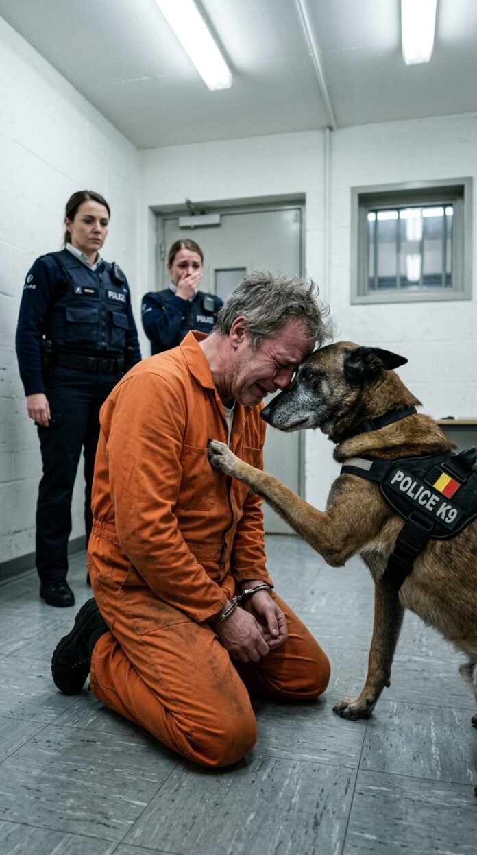 At that instant, something inside Ethan broke. He leaned forward as far as his handcuffs allowed, burying his face in the dog’s fur. His shoulders shook, his breathing uneven. This wasn’t ordinary crying—it was years of pain finally spilling out.