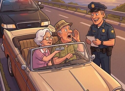 Martha and Harold had been counting down to their retirement road trip like kids waiting for summer break. The car was packed, their favorite country playlist was rolling, and the open highway made everything feel new again. Martha drove with a bright grin and the confidence of someone who finally had nowhere to be on anyone else’s schedule. Harold relaxed in the passenger seat, soaking in the sunshine—until Martha’s “just enjoying the ride” speed crept a little higher than it should have. Then flashing red-and-blue lights appeared in the mirror, instantly turning joy into nervous silence.