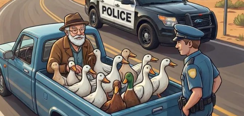 The morning traffic downtown was crawling along at its usual pace when a police officer spotted something that immediately caught his attention. An old pickup truck was moving steadily through the street, but what filled the open truck bed was anything but ordinary. Instead of tools or supplies, it was packed with ducks—no cages, no crates—just a flock standing calmly side by side, quacking as if they were on a casual outing. Maintaining his professionalism, the officer pulled the vehicle over and approached the elderly driver, who greeted him with a friendly smile. In a calm but firm tone, the officer explained that transporting a group of ducks through busy city streets in that manner was not appropriate and advised the man to take them to the zoo right away. The driver nodded politely, thanked the officer, and drove off without argument.