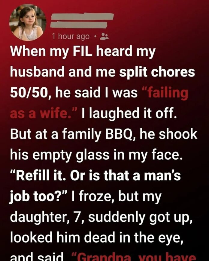 The comment didn’t sting at first. When my father-in-law heard that my husband and I shared responsibilities equally at home, he laughed and said I was “failing as a wife.” I brushed it off, choosing peace over pride. In our home, we believed in partnership—cooking together, cleaning together, raising our daughter side by side. It felt right to us, even if others didn’t understand. Still, his words lingered quietly in the back of my mind, like a small cloud I refused to look at directly.