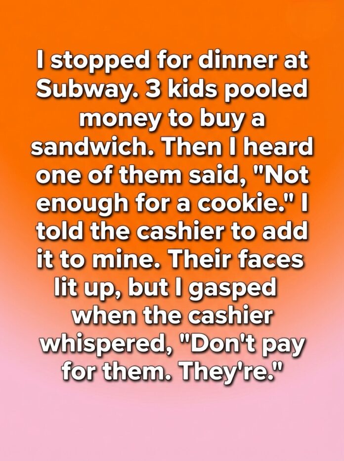I stopped for dinner at a small sandwich shop after a long workday, hoping for something quick before heading home. In front of me stood three kids counting coins and crumpled bills on the counter, whispering as they tried to make their money stretch. They finally ordered one sandwich to share, but when they realized they couldn’t afford a cookie, disappointment flickered across their faces. Without thinking much, I told the cashier to add the cookie to my order.
