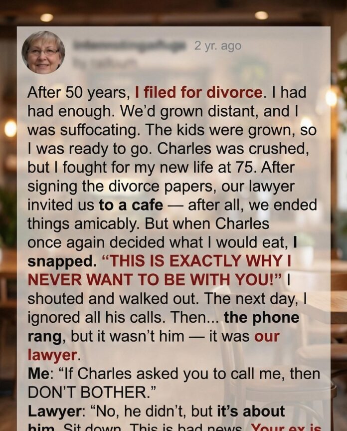 After fifty years of marriage, Margaret believed she had reached the end of her strength. Her children were grown, her home felt quiet, and the distance between her and her husband, Charles, had slowly turned into loneliness. Feeling that she had lost herself while always putting others first, she made the difficult decision to file for divorce, hoping to finally find peace and independence in her later years.