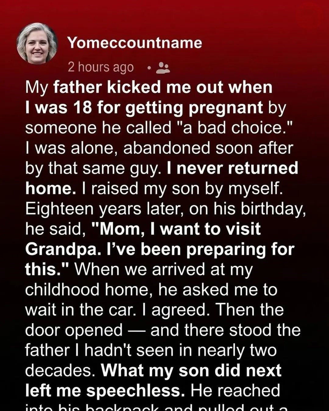 That question finally came on his eighteenth birthday. Calm and thoughtful, he told me he wanted to meet his grandfather. I felt a mix of emotions—uncertainty, hesitation, and something I hadn’t expected: hope. When we arrived at my childhood home, he asked me to wait in the car. I watched as he walked to the door, steady and confident. When it opened, I saw my father for the first time in nearly two decades. Time had softened him, but the past still lingered between us, unspoken.