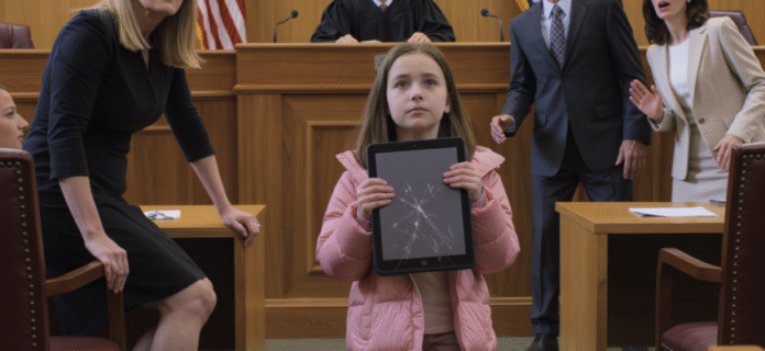 But she didn’t run to me. She didn’t run to her father. She walked straight toward the bench, her little sneakers squeaking on the polished floor, and in her hand she held a shattered, taped-up tablet that I thought had been broken months ago.