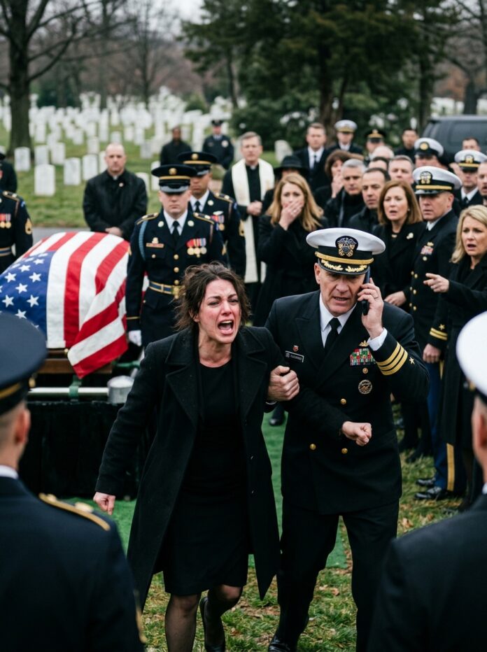 At my father’s memorial, a Navy admiral grabbed my arm and told me the front row was for service members only. Then his phone rang. He listened, went pale, and the next words out of his mouth changed the whole room: “Sir… understood. Release her. Now.”