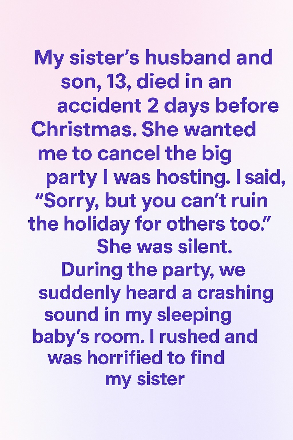 When my sister’s husband and 13-year-old son died in a tragic accident just two days before Christmas, her world shattered. She begged me to cancel the big Christmas party I had planned for weeks. I told her gently, “I’m sorry, but I can’t let this ruin the holiday for everyone else.” She said nothing, just looked at me with eyes full of pain. I thought giving people joy was still important, even if we were hurting.