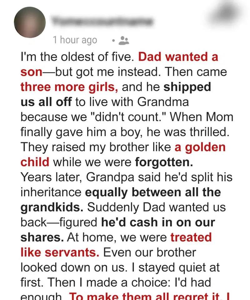 My father discarded me and my sisters like junk mail simply because we were not boys. When I got older, I made sure he regretted it in unexpected ways, including lawyers and courtrooms.