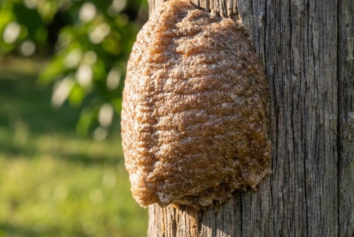 At first glance, it looks like something that doesn’t belong — a strange, hard, foam-like brown mass stuck to a fence post or branch. It’s not quite a nest, not exactly fungus, and definitely not something you remember putting there. Most people instinctively reach for a scraper… then pause. Is it dangerous? Is it alive? Before you knock it off, you might want to take a closer look — because what seems odd or even unpleasant at first could actually be one of the most beneficial signs your backyard ecosystem is thriving.