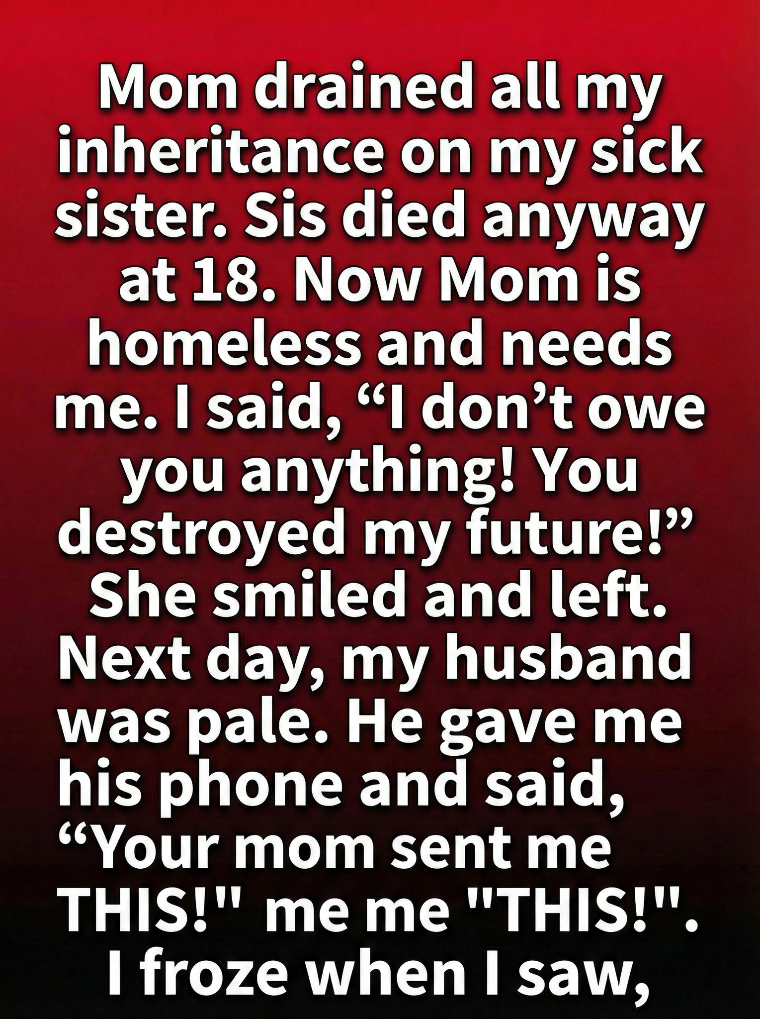 Mara had always believed that love meant sacrifice, but sacrifice had a way of hollowing her out. When her younger sister fell ill, their mother emptied every account, sold every asset, and borrowed against Mara’s inheritance without asking. Doctors came and went, bills stacked like bricks, and Mara watched the future she’d planned crumble quietly. In the end, her sister passed away just after her eighteenth birthday. Grief turned to anger, and when their mother appeared at Mara’s door months later—tired, thin, and carrying everything she owned in a single bag—Mara’s heart snapped. She said words she had rehearsed for years, sharp and trembling. She told her mother she owed her nothing. That her future had been destroyed. Her mother only smiled, a sad, knowing smile, and walked away without another word.