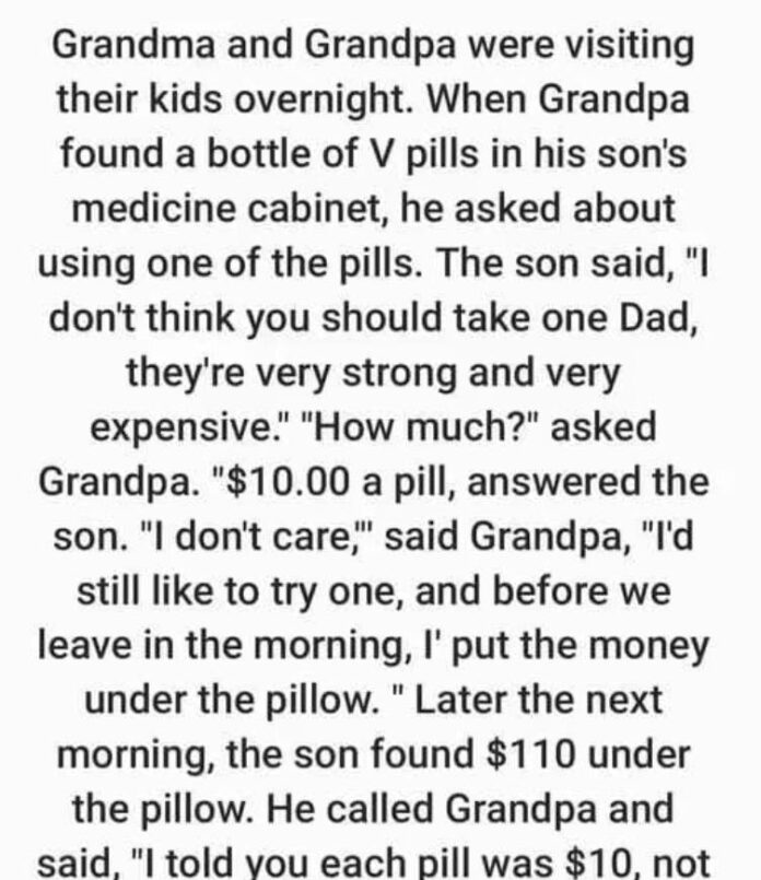 Grandma and Grandpa were visiting their kids overnight.When Grandpa found a bottle of V pills in his son’s medicine cabinet, he asked about using one of the pills.