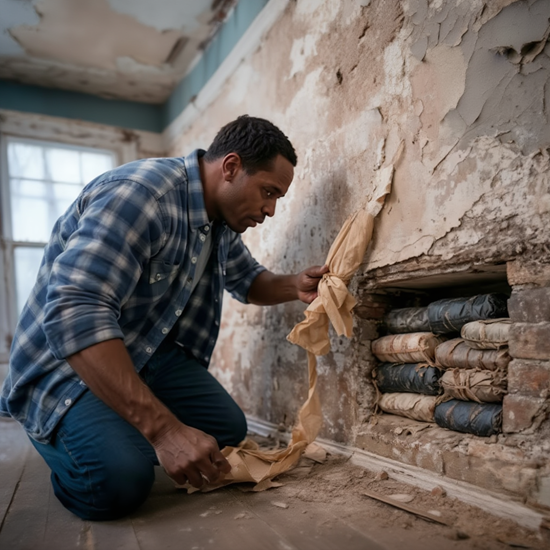As he continued, he realized the wallpaper had been applied in multiple layers over time, suggesting that the hallway had been repeatedly redecorated without fully stripping previous materials from the surface beneath.