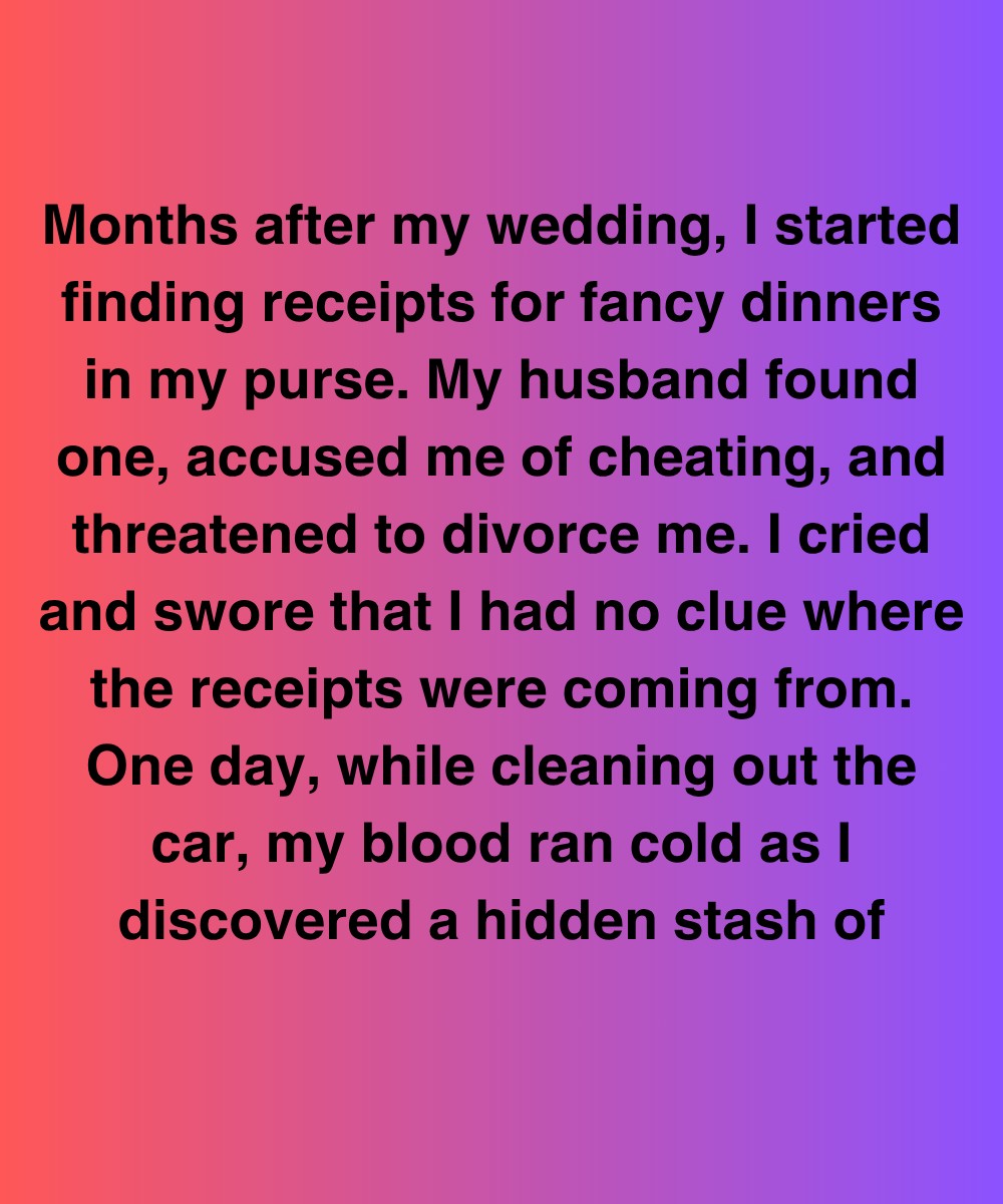 Months after my wedding, I started finding receipts for fancy dinners in my purse. My husband found one, accused me of cheating, and threatened to divorce me. I cried and swore that I had no clue where the receipts were coming from. One day, while cleaning out the car, my blood ran cold as I discovered a hidden stash of receipts—folded neatly inside an envelope, tucked under the passenger seat mat.
