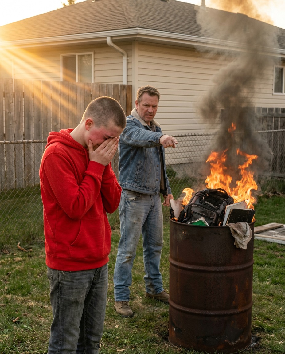 Not just a handful of shirts or a box of things from the garage. He dragged out my clothes, my notebooks, my work boots, my mother’s old coffee mug I had hidden in my closet, the framed photo from my high school graduation, even the secondhand laptop I had bought with money from roofing jobs that summer. He dumped it all into a metal barrel behind our house in Dayton, Ohio, and set it on fire like he was purifying the family name.
