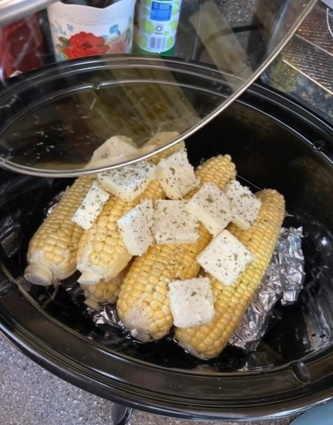 Start by cleaning and husking 6–8 fresh corn cobs. Arrange them in the crockpot, stacking neatly so they cook evenly. In a small bowl, melt ½ cup of butter and mix in your favorite spices — garlic powder, paprika, salt, pepper, and even a little chili powder for a kick. Pour the butter mixture evenly over the corn, then add ½ cup of water or broth to keep it moist while cooking.