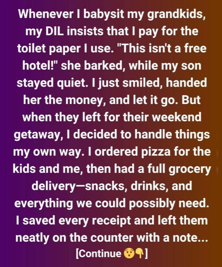 Whenever I babysit my grandkids, my daughter-in-law insists that I pay for the toilet paper I use. “This isn’t a free hotel!” she snapped once, while my son stood by, silent. I just smiled, handed her the money, and let it go. But when they left for their weekend getaway, I decided to handle things my own way. That Friday night, I ordered pizza for the kids and me, then scheduled a full grocery delivery—snacks, drinks, and everything we could possibly want. By the time they returned Sunday evening, their fridge and pantry were overflowing with fresh, high-quality food, all paid for by me.