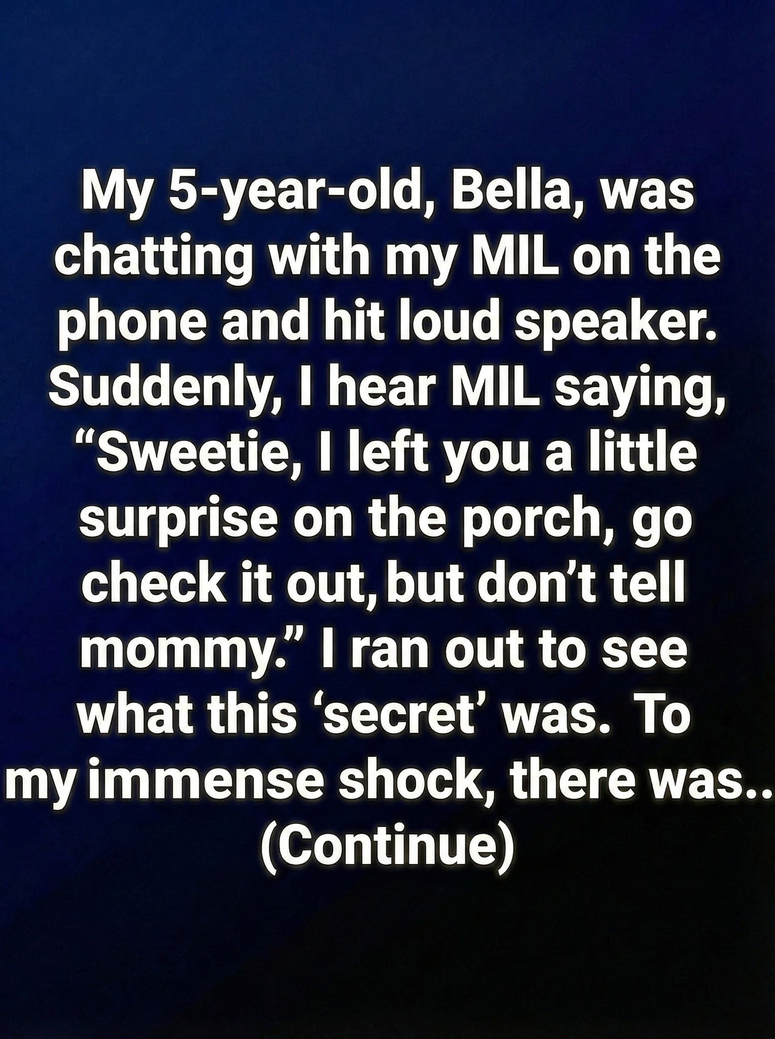 It was a quiet afternoon when my five-year-old daughter, Bella, sat on the couch chatting happily with my mother-in-law on the phone. I was folding laundry in the next room when I heard Bella press the loudspeaker button, her small voice echoing through the house. They laughed about school and toys until my mother-in-law lowered her voice playfully and said, “Sweetheart, I left you a little surprise on the porch. Go check it out—but don’t tell Mommy just yet.” Bella’s eyes widened with excitement. Before I could ask what was going on, she hopped off the couch and dashed toward the front door. Curiosity got the better of me, and I followed a few steps behind.
