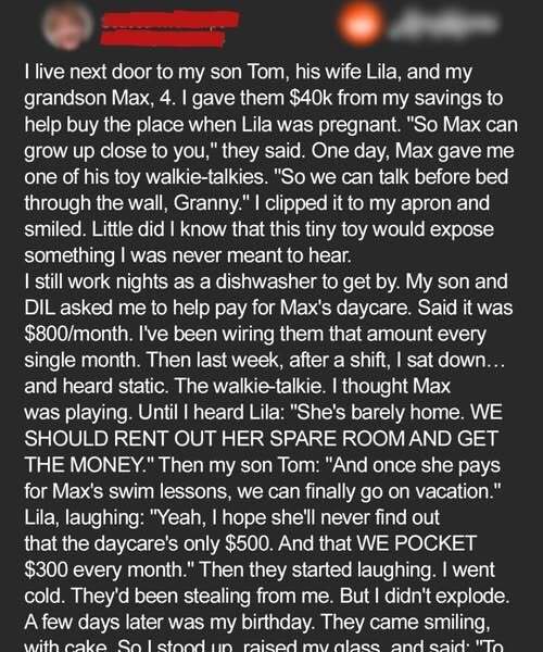 They were laughing. About renting my spare room without telling me. About me covering Max’s swimming lessons so they could vacation in Hawaii. About how daycare was really $500, and they’d been pocketing the extra $300 every month. Thomas joked about putting me in a nursing home someday.