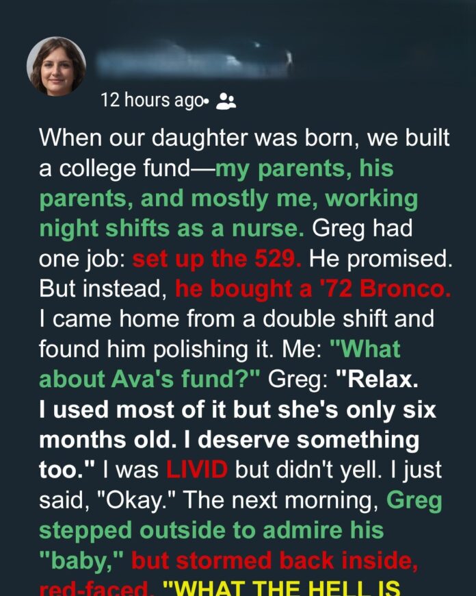 My husband Greg promised to secure our daughter Ava’s future. Instead, he spent her $45,000 college fund on a rusty 1972 Ford Bronco. That money came from both our families and months of overtime shifts I worked as a nurse. Greg had one job—deposit it in a college fund. But the moment he saw that truck, reason flew out the window.