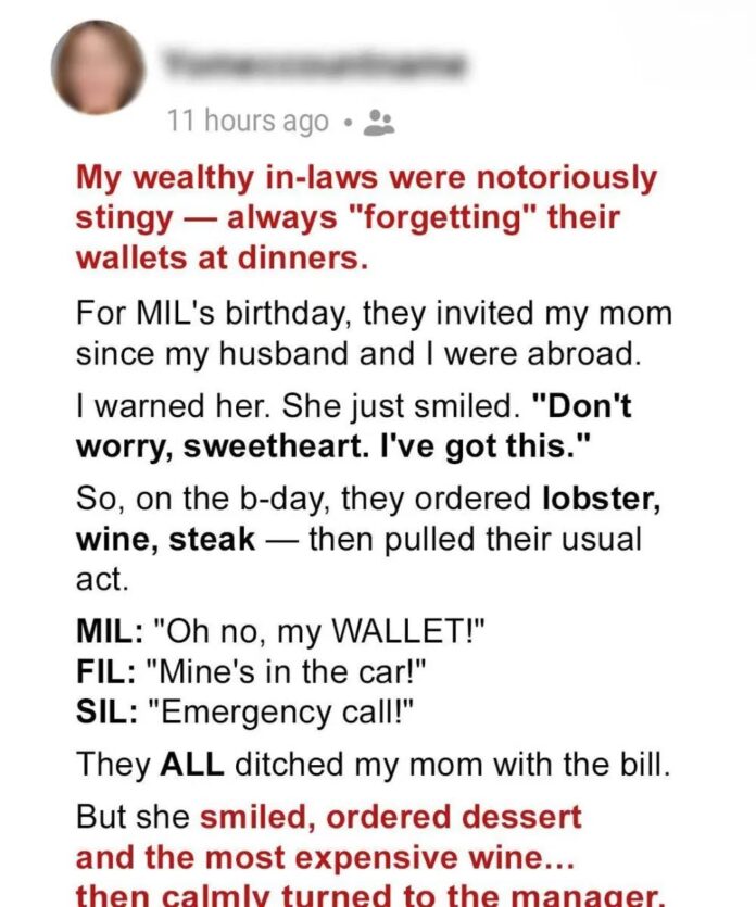 The manager called my in-laws, politely reminding them that their bill remained unpaid and that if it wasn’t settled promptly, the “proper authorities” might have to be notified. Within minutes, they returned, faces flushed, wallets suddenly found. My mom thanked the staff, savored her dessert, and left with quiet dignity.