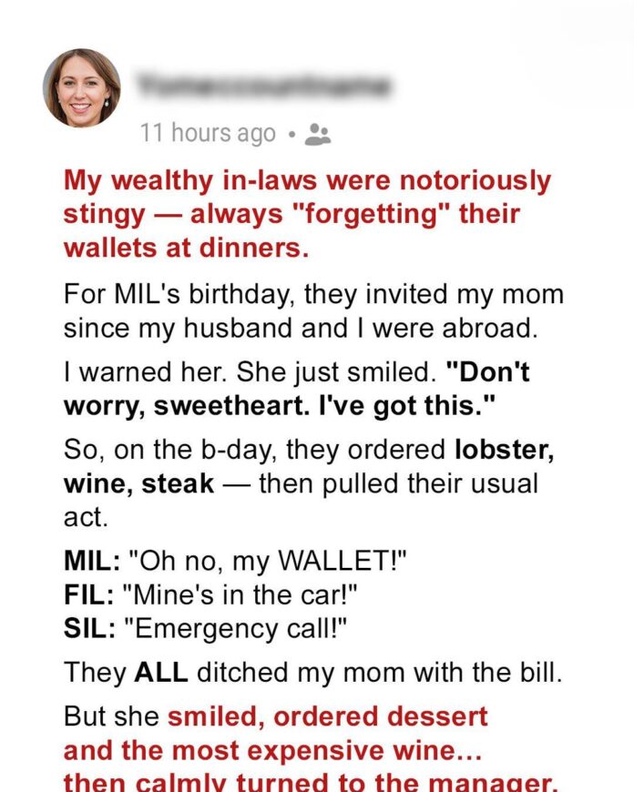 It started as one of those family habits everyone whispers about but never confronts. My husband’s wealthy parents had a long-standing reputation for “forgetting” their wallets at restaurants — a trick that left others footing the bill for their extravagant meals. I’d seen it happen too many times to count. So when they invited my mom to an upscale Italian restaurant for a birthday dinner — while my husband and I were away — I felt uneasy. I warned her what might happen, but she just smiled calmly and said, “Sweetheart, don’t worry. I’ll handle it.”