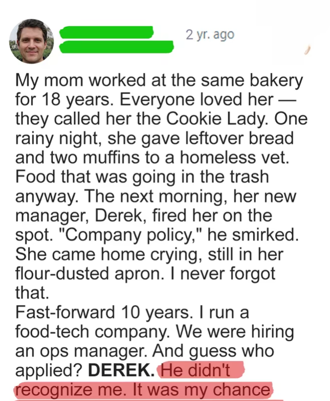 When I was 25, I watched my mom, Cathy — known to our town as the Cookie Lady — get fired from Beller’s Bakery for giving two leftover muffins and some bread to a homeless veteran. Her new manager, Derek, called it “theft.” She came home that night with flour still on her apron, trying to hide her tears. “It’s alright,” she told me. “I have more good in me than he has power.” I carried that moment like a stone in my pocket for the next ten years.