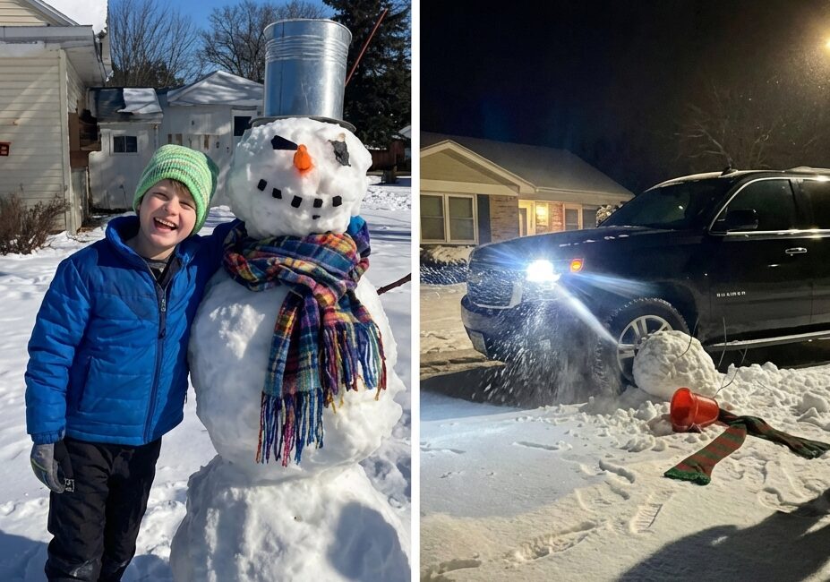 The problem wasn’t the snow—it was the tire tracks. Our neighbor, Mr. Streeter, had developed a habit of cutting across the very corner of our lawn when pulling into his driveway. At first, I brushed it off. Snow melts, grass grows back, and small irritations usually fade. But the pattern didn’t stop. One by one, Nick’s snowmen were flattened. Some days he rebuilt them quietly; other days he came inside with wet gloves and glossy eyes, whispering, “He did it again.” When I politely asked our neighbor to avoid that part of the yard, he dismissed it as trivial. To him it was “just snow.” To my son, it was the small piece of the world that belonged to him.