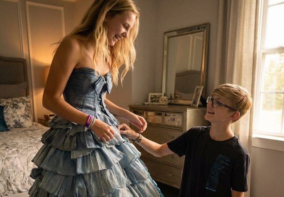 My brother Noah was only fifteen, but he remembered the sewing skills he had learned in a school class the year before. One evening he walked into my room carrying a stack of our mom’s old jeans and asked if I trusted him. His plan was simple but ambitious: turn those memories into a prom dress. When our stepmom wasn’t around, we quietly set up my mom’s old sewing machine and started working. Piece by piece, Noah stitched together a design using different shades of denim, carefully shaping the fabric until it became a fitted dress with flowing panels that somehow felt both creative and deeply personal.