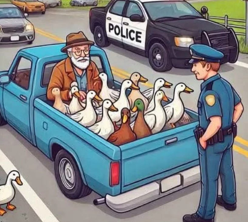 A policeman was patrolling downtown when he spotted an old man driving a rusty pickup truck with the bed absolutely overflowing with ducks. They were waddling, quacking, and sticking their heads over the side like a feathery parade. The officer pulled him over and said sternly, “Sir, you can’t have a flock of ducks wandering around downtown. Take them to the zoo immediately!” The old man nodded seriously, tipped his hat, and drove off without another word.