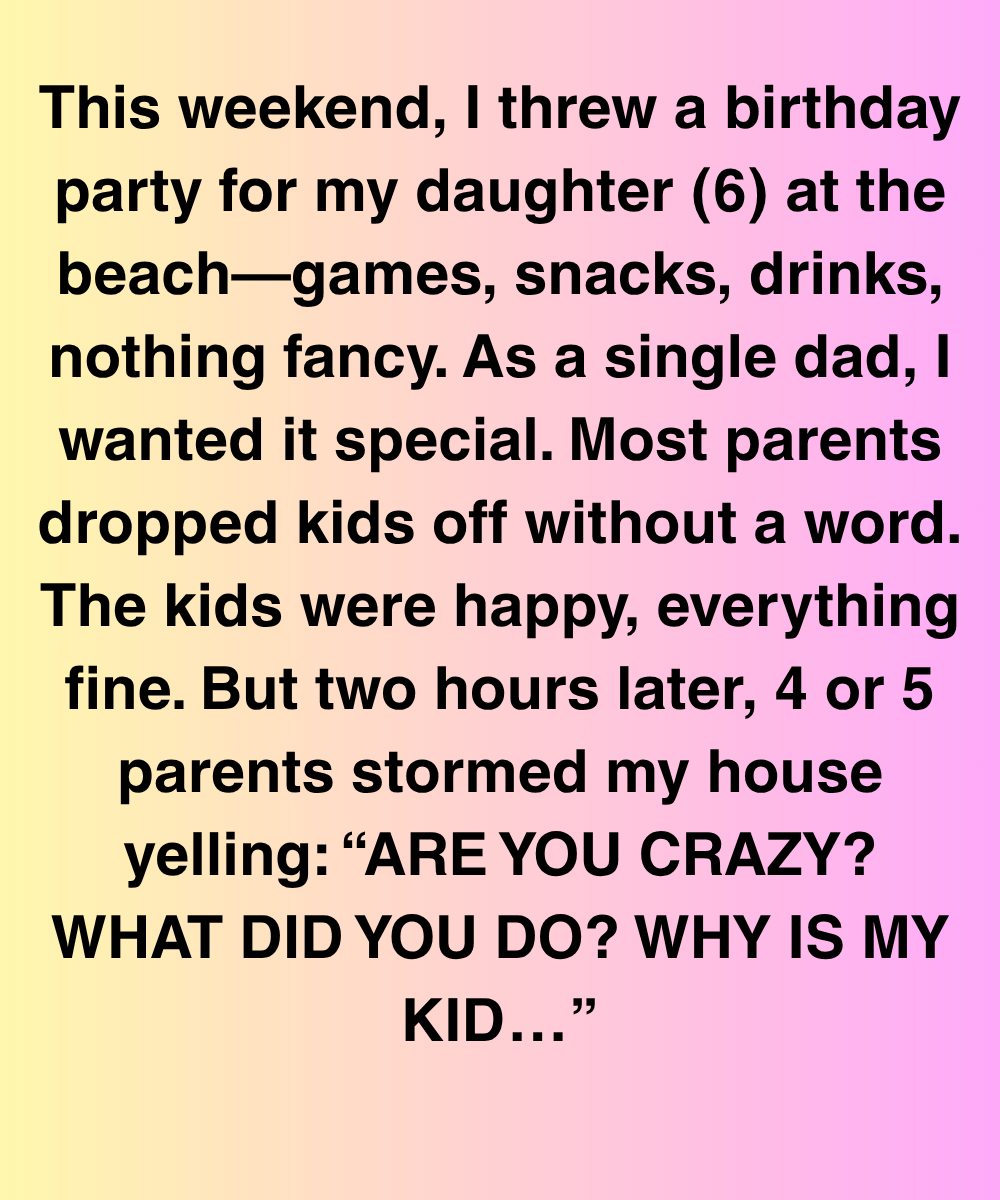 Nothing fancy — just the beach, a few games, snacks, and juice boxes. I didn’t have a big budget, but I had time, energy, and love. As a single dad, I’ve learned those go a long way. Most parents dropped their kids off without a second thought. “Have fun!” they called, then drove away. I took it as a sign of trust. The kids were thrilled. They ran across the sand, screaming with joy, chasing waves, daring each other to get closer to the water. My daughter’s smile never left her face. For two hours, everything was perfect. Then, out of nowhere, four or five parents stormed up to my house later that afternoon, their voices sharp, their faces furious. “ARE YOU CRAZY? WHAT DID YOU DO? WHY IS MY KID…?”