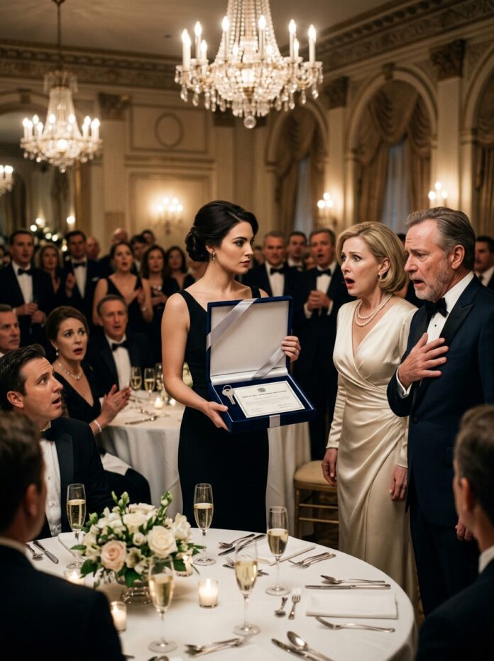 A few women beside her smiled in that thin, uneasy way people smile when they know they are being invited into something unkind but do not want to seem humorless. Crystal chandeliers glowed overhead. Candlelight softened the white linen and silver flatware. Somewhere behind me, a violinist drew one delicate note and then stopped when the tension in the room sharpened enough to make music feel inappropriate.