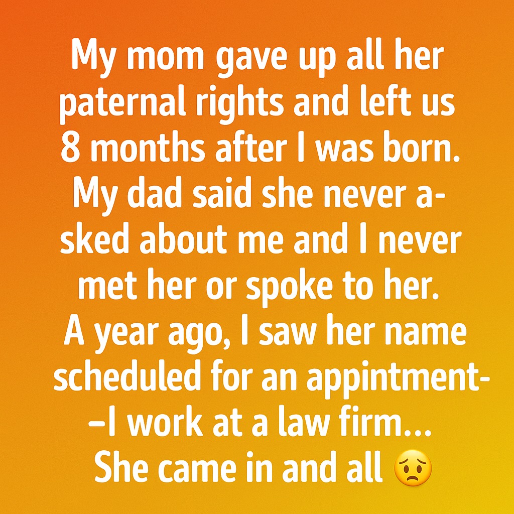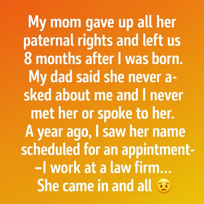 My mom gave up all her parental rights and left when I was just 8 months old. Growing up, it was always just my dad and me. Whenever I asked about her, he said she never called, never asked about me, never cared. I grew up believing she was a ghost alive somewhere, but dead to me. I never met her. I never heard her voice. She was just a missing piece of my story. Then, a year ago, something happened that I could never have prepared for. I was at work a law firm where I’d been building my career when I saw her name on the appointment schedule.