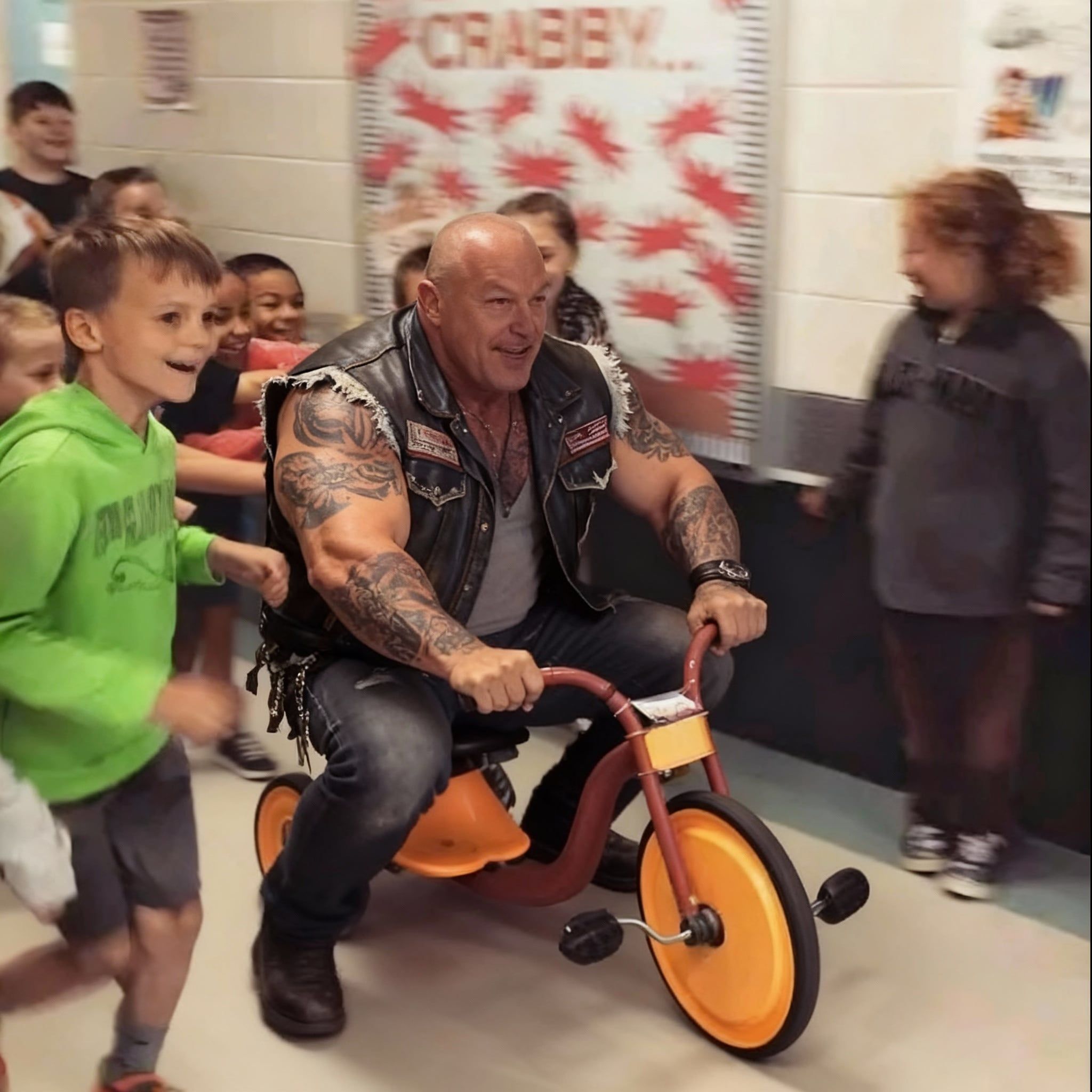 I watched him crash the tricycle on purpose. Watched him sprawl dramatically on the floor while the children piled on top of him, laughing. This massive man covered in skull tattoos letting dying kids use him as a human jungle gym.