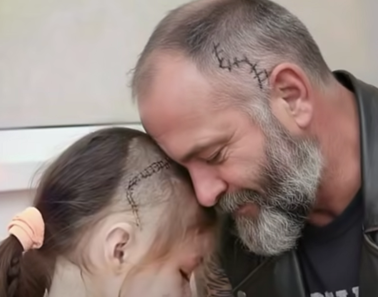 That’s when I thought of Gabriel, one of our hospital volunteers. He was a retired veteran who rode a motorcycle and had a presence that could fill a room — strong, quiet, and unexpectedly soft-hearted when it came to children. More importantly, he carried a scar of his own, one that traced the same path across his temple as Lily’s. When I called him and explained the situation, he arrived without hesitation. He stepped into Lily’s room gently, his voice warm and steady as he introduced himself and praised her courage. And when she still hid her face, Gabriel slowly removed his own bandana and turned his head, showing her his scar, worn and healed with time.
