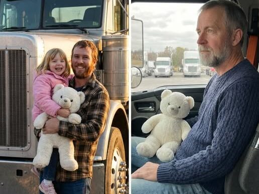 Snow — that’s what Emily named him — became part of our ritual. Every time I left for a long trucking haul, she insisted I buckle him into the passenger seat. “He’ll protect you,” she’d say, dead serious, arms crossed like a tiny supervisor. Even when she grew older and pretended she’d outgrown the tradition, she still handed Snow to me quietly before every trip. Life at home grew complicated over the years — her mom and I drifted apart, and eventually divorced — but that bear remained a steady presence. Then cancer entered our lives, and hospital rooms replaced truck stops. Emily carried Snow to treatments and cracked jokes with nurses, determined to stay brave. Two weeks after she made me promise to “keep driving,” she was gone.
