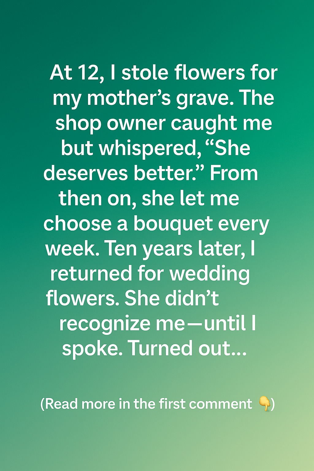 At 12, I stole flowers for my mother’s grave. I didn’t do it out of mischief—I just wanted something beautiful to place beside her headstone. My family had very little then, and grief felt heavier when all I had to offer were wildflowers I’d gathered from the roadside. That day, I slipped a small bouquet from the corner of a flower shop, thinking no one saw me. But as I turned to leave, the shop owner gently stopped me.