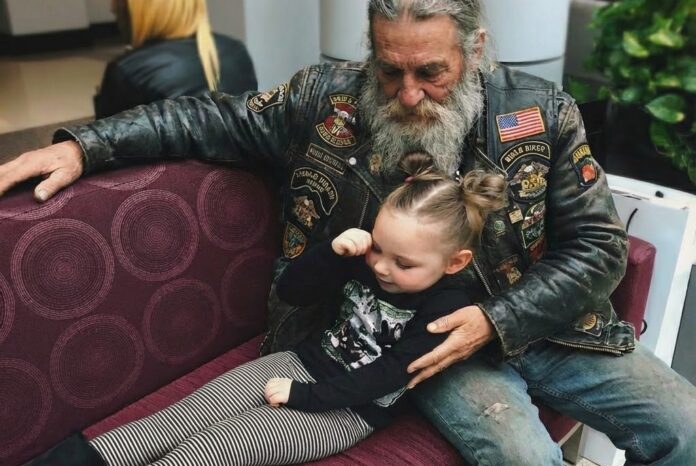 She came out of nowhere in the middle of the airport crowd, small shoes slapping against the tile, eyes wild with fear. Before I could even react, she wrapped herself around my leg and screamed one word that made every head turn: “Grandpa!” Her face was pressed into my jeans, her tiny body shaking as if she’d finally found shelter after running too long in a storm. I froze. I was six-foot-three, covered in tattoos, wearing a biker vest that usually made people keep their distance. I had never seen this child before in my life, yet she clung to me like I was the only safe thing left in the world.