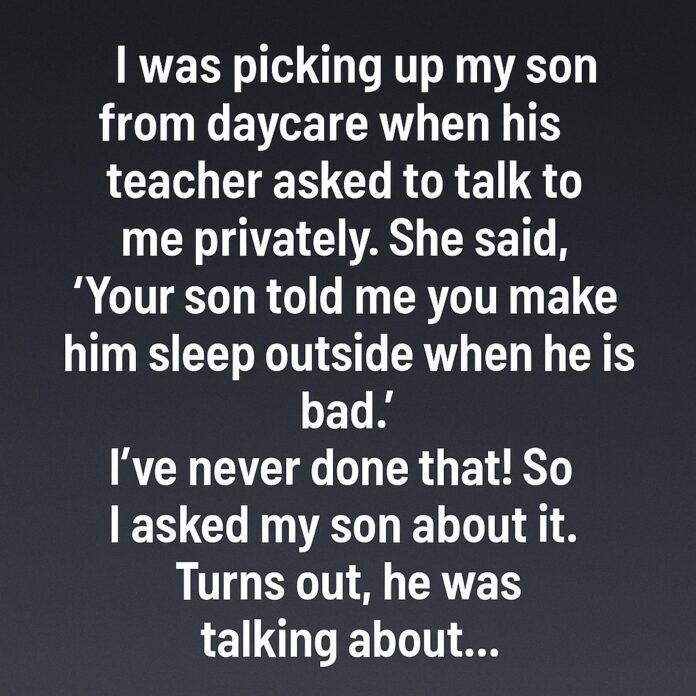 I was picking up my son from daycare when his teacher gently asked if we could talk in private. Her expression was serious, and my heart began to race. She said, “Your son told me you make him sleep outside when he is bad.” For a second, I couldn’t find the words. I had never done anything like that. Confusion and worry filled my mind as I tried to understand where this was coming from.