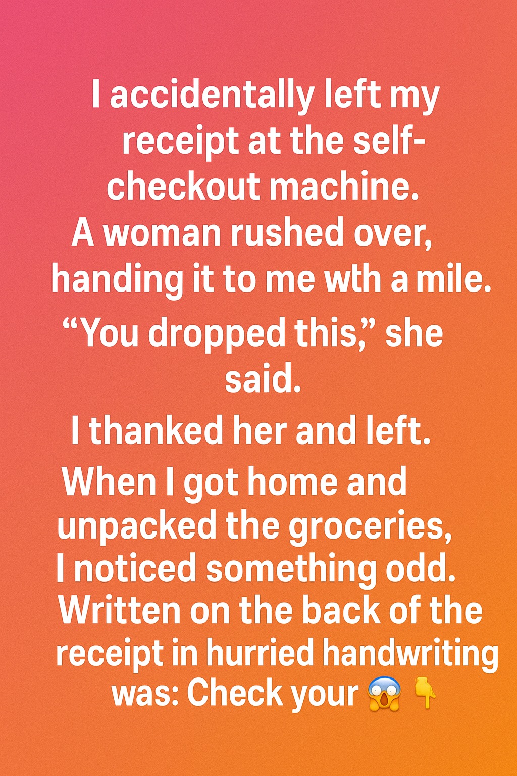 I accidentally left my receipt at the self-checkout machine. A woman rushed over, handing it to me with a warm smile. “You dropped this,” she said softly. I thanked her and left, thinking nothing of it. When I got home and began unpacking my groceries, I noticed something odd. Scrawled on the back of the receipt in hurried handwriting were the words: “Check your car trunk.”