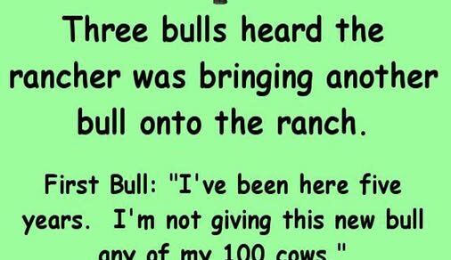 Third Bull: “I’ve only been here a year, and so far, you guys have only let me have 10 cows. I may not be as big as you fellows, but I’m keeping all 10 of my cows.”