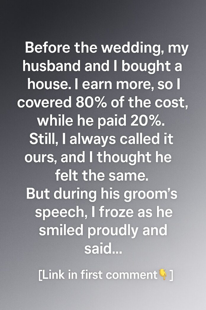 Before the wedding, my husband and I bought a house. I earn more, so I covered 80% of the cost, while he paid 20%. Still, I always called it ours, and I thought he felt the same. But during his groom’s speech, I froze as he smiled proudly and said…“…I’m so grateful to have a wife who will make our house feel like a home.” Everyone cheered, but my heart sank. The way he emphasized our house felt different, almost possessive. I brushed it off as wedding-day nerves and told myself I was overthinking.