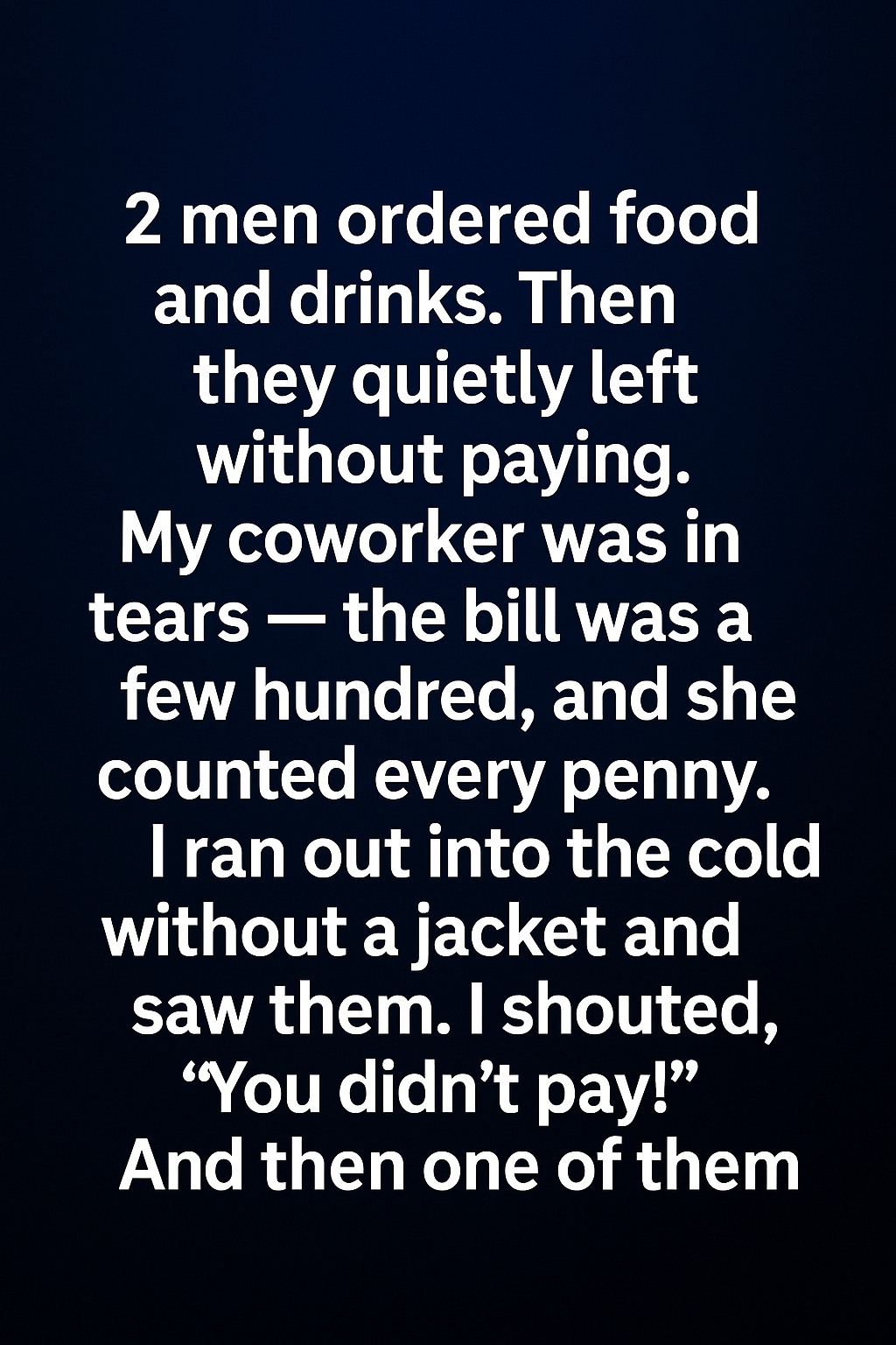 Seeing her so upset, I couldn’t just stand there. Without thinking, I ran outside into the freezing night, no jacket on, my breath coming out in white clouds. Down the street, I spotted them.“You didn’t pay!” I called out, my voice trembling more from nerves than the cold.The two men turned around, startled. For a moment, there was silence. Then, one of them sighed deeply and walked toward me.