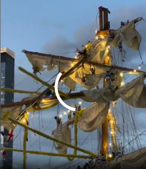 Crew members were hanging onto the rigging of the Mexican Navy tall ship that crashed into the Brooklyn Bridge Saturday night, video footage shows.